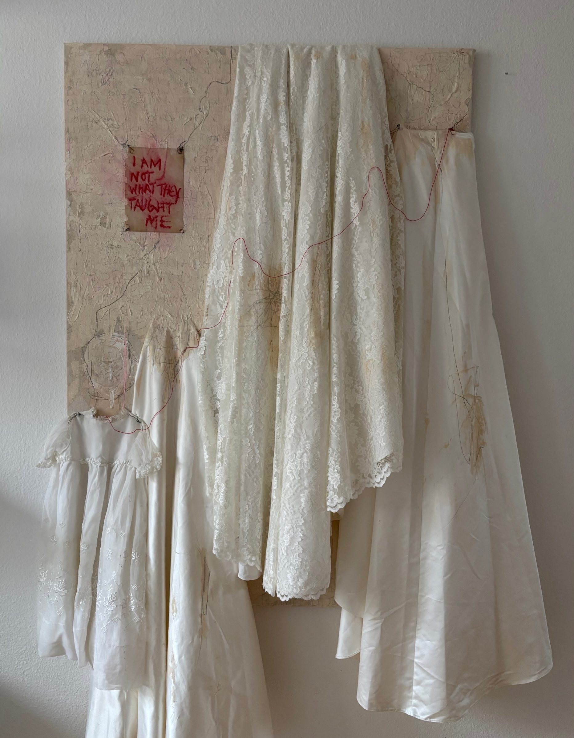 Katja Jungwirth is a self-taught artist based in Munich, Germany. Her work delves into the intricate layers of personal and collective narratives, often exploring themes of identity, tradition, and the unspoken aspects of human experience. Through a multidisciplinary approach, she uses materials such as textiles, paint, and found objects to create pieces that invite introspection and dialogue. Her artistic practice is a journey into the spaces between what is seen and what is felt. She is drawn to the stories that linger beneath the surface...the emotions we suppress, the traditions we inherit without question, and the roles we assume in society. Through her art, she invites viewers to pause and reflect on their own narratives. She creates spaces where unspoken emotions find a voice, and where the familiar is seen through a new lens.